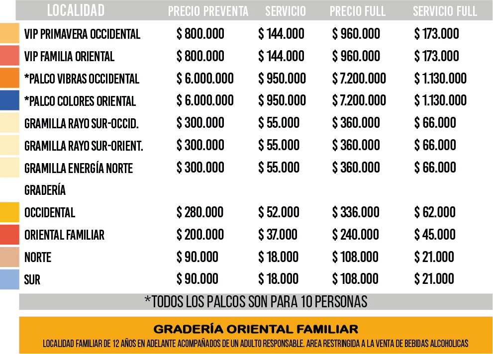 | Palcos Vibras Occidental | $600.000 + $95.000 | 600 |